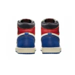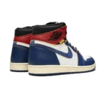The Union x Air Jordan 1 “Storm Blue” is one of two special editions of Michael Jordan’s first signature shoe from the Los Angeles menswear boutique. The cut and paste theme of the collaboration by Union combines two original colorways of the Air Jordan 1 into one shoe. For the “Storm Blue” colorway, the design combines the body of the original white and blue version with the red and black ankle of the “Bred” colorway. The colorway has a vintage look with yellowed leather that has a distressed treatment around the ankle paneling. A “UN/LA” patch is added to each ankle to complete the unique construction.